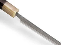 , bietet ein hervorragendes Schärfepotenzial. Der Schneidkern besteht aus Aogami Super, dem blauen Papierstahl. Der Stahl ist ein echter japanischer Kohlenstoffstahl und kann sehr hart geschmiedet werden. Er zeichnet sich durch feinstes Martensit – metastabiles Gefüge – aus, das für höhere Härte und eine ausgezeichnete Schärfe sorgt. Ein weiterer Vorzug ist, dass Aogami super trotz hoher Härte leicht geschliffen werden kann und aufgrund des hohen Anteils von Wolfram eine sehr gute Standfestigkeit zeigt. Mit diesem Schneidkern bieten die Messer dieser Serie also eine außergewöhnlich hohe Schärfe, Schneidleistung und Beständigkeit.