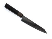 -Wert, Messgröße für die Härte des Stahls, liegt bei 61. VG-10 ist ein Edelstahl und enthält im Unterschied zu den Kohlenstoffstählen Aogami oder Shirogami ca. 15% Chrom. Die Ummantelung besteht aus Nickel Damast in 30 Lagen. Das Paket wird von Meister Yoshimi Kato von Hand kaltgeschmiedet. Finish: Optisch wird die Klinge natürlich durch die Damast Lagen dominiert. Um einen zusätzlichen Schutz mit rosthemmender Wirkung zu erzielen, sind die Kurosome Messer brüniert, was die edle Optik unterstreicht. Griff: Der Griff dieser Messer ist aus hochwertigem