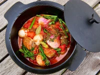 | Maße: | Ø 23,5 innen, 27 cm außen B 32 cm, H 9, mit Deckel 13 cm Boden Ø 18,5 cm Inhalt: 3,25 Liter |