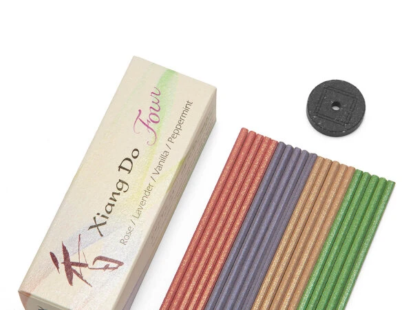 Vier Düfte: Rose, Lavendel, Vanille und Pfefferminz. Die Xiang Do Räucherstäbchen werden mit einem besonderen Pressvorgang duftintensiver gemacht als ähnliche Räucherstäbchen in der Größe. Sie haben kein Trägerholz und enthalten nur natürliche Inhaltsstoffe und keinerlei synthetische Öle, Duftstoffe oder Bindemittel. Die feinen Räucherstäbchen werden inklusive einem Räucherstäbchenhalter geliefert.