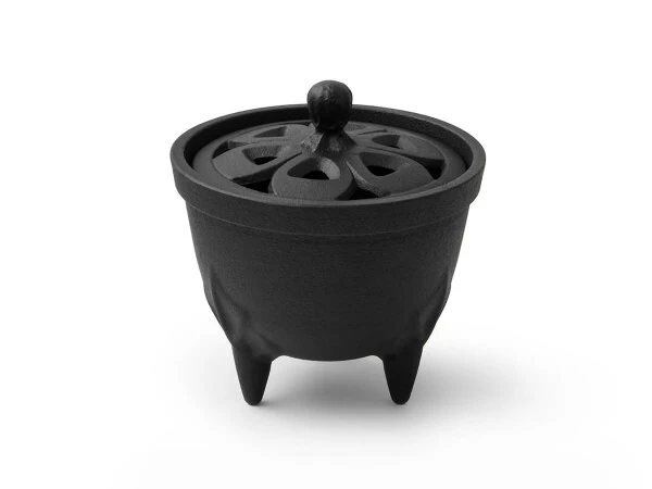 Handgefertigtes, schönes Räuchergefäß Sakura (Kirschblüte) für Weihrauch, Räucherstäbchen, Räucherkegel, japanische Räucherspiralen und Räuchern von Harzen und Kräutern mit Kohle. Die Ausschnitte im Deckel sind den in Japan verehrten Kirschblüten nachempfunden, der Griff stellt eine Kirschblüten-Knospe dar. Hersteller ist Iwachu, der bekanntesten Marke für hochwertige Produkte aus Gusseisen im Nambu Tekki Verfahren.