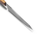 , auch Messer der drei Tugenden genannt, ist das typische Allzweckmesser, das man immer zur Hand haben sollte. Für Fleisch, Fisch und Gemüse. An diesem Messer ist nichts gewöhnlich: Weder die Form der Klinge, die Form des schönen Griffs, oder der verwendete Stahl. Jikko hat die Klingen der Serie Kuin oku aus SG2, einem modernen, pulvermetallurgischen Stahl gefertigt. Die Schnittleistung von SG2 oder SGPS ist wie auch die Härte des Stahls sehr hoch, bei der Rostbeständigkeit erreicht der Stahl einen Spitzenwert. Schärfe und Schneidhaltigkeit erreichen annähernd die Werte von Aogami Super. Schön und ergonomisch ist der Griff aus dunkler Eiche. Mit ihm hat man die für ein