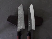 Die Messerhalter von Noyer gibt es in verschiedenen Größen: 25 cm, 40 cm, 60 cm und 80 cm. Sie werden aus einem Stück Holz geschnitten, das beispielsweise 40 cm lang ist. Die Länge des fertigen Produktes variiert jedoch geringfügig. Alle Messerblöcke werden von Hand gefertigt und jeder Artikel unterscheidet sich in der Form von dem anderen. Sie sind alle in 45-Grad-Winkel geschnitten und lassen sich sehr einfach mit zwei Schrauben an einer Wand befestigen. Die Schrauben sind nach der Montage nicht mehr sichtbar. Der magnetische Teil besteht aus kleinen, aber sehr starken Neodym-Magneten. Zum Beispiel: In die Magnetleiste mit 40 cm sind 20 kleine Magnete eingebaut, damit sich die Messer nicht „drehen“, wenn sie auf den Messerhalter aufgebracht werden. Die magnetischen Messerhalter sind für mindestens 3 (25 cm), 5 (40 cm), 8 (60 cm) und 11 (80 cm) Messer geeignet. Die Front der Messerhalter besteht aus amerikanischem Walnuss Holz oder schwarz lackierte Esche.